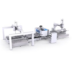 Three-station gantry loading machine, the whole machine is controlled by touch screen + PLC, can be connected (access to the central control system), and can be used independently as a stand-alone machine. The whole machine adopts a heavy-duty gantry structure; automatic infeeding in 4 directions ,can meet the infeeding needs of all customers. The movement uses high-power servo + planetary reducer, and the Z-axis uses high-strength special aluminum material to effectively ensure the stability of high-travel movements. Panel adsorption uses a whole-strip vacuum suction cup, which has stable suction force and a large adsorption area. Equipped with an automatic centering conveyor platform, which can automatically realize the centering positioning operation of panels.